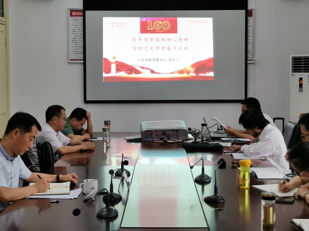 7月4日下午,学院党委书记张红飞在红楼二楼会议作了题为“百年党史砥砺初心使命 信仰之光照亮奋斗征程”的专题党课报告。yl7703永利官网历史学专业教工党支部全体党员参加了报告会。历史学专业教工党支部书记李正君主持会议。