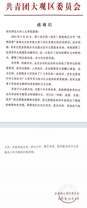 近日,大观区团委致函yl7703永利官网,对永利官网青年学生在第十届中国(安庆)黄梅戏艺术节“热辣滚烫”黄梅戏文化市集活动中的志愿服务工作表示赞扬与感谢。