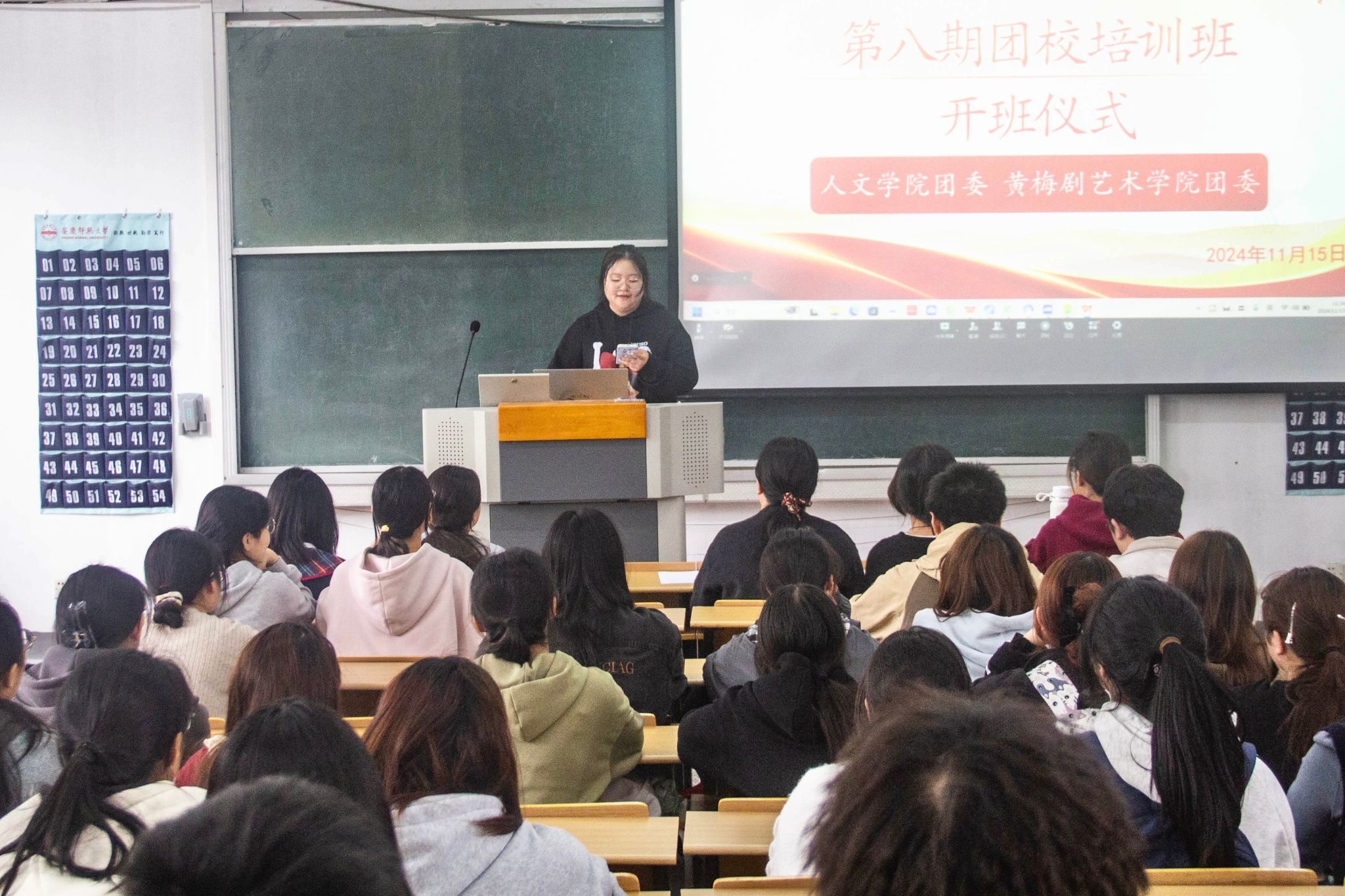 黄梅剧艺术学院团委副书记宣读了团校培训班纪律,要求学生以端正的态度在团课中汲取思想伟力,确保团校培训班的课程的高效运转。