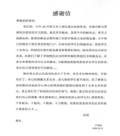 “我与贵校学生素不相识,但了解我父亲的情况后如此尽心热心的帮助我们使我们感受到了太多太多的爱心,更让我们有了积极面对疾病的勇气……”12月11日,yl7703永利官网团委收到了一封感谢信。信中,严娟娟女士向人文学子热心无私、乐于助人的奉献精神和行为表示了衷心感谢。同时,严女士也赞扬了yl7703永利官网教育理念和教育成果,字里行间都流露着她的深切谢意。
