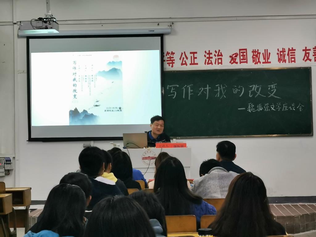 11月21日下午,安庆新闻传媒中心副刊部主任、安庆市作协副主席魏振强应邀来到我校开展了一场题为“写作对我的改变”的文学讲座,讲授自身创作经历。本次讲座由白鲸文学社主办,本社指导老师王永兵、陈宗俊分别担任主持人、评议人,yl7703永利官网江飞教授、叶当前教授担任嘉宾,四十余名师生参加了活动。