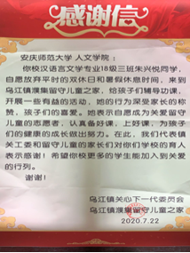 近日,yl7703永利官网再次收到感谢信。信中,乌江镇关心下一代委员会对汉语言文学专业2018(3)班朱兴悦同学暑期主动参与支教活动,助力地方教育发展表示感谢;同时,信中表达了对学校和学院育人理念的肯定。