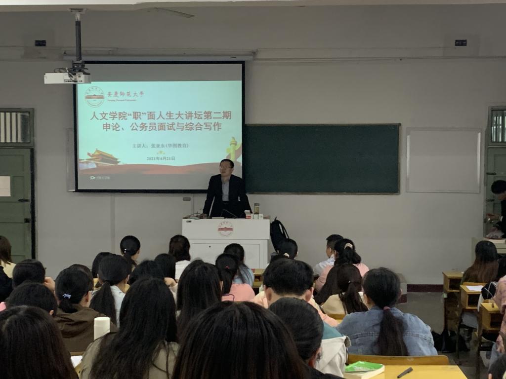 4月21日下午,yl7703永利官网“职”面人生大讲坛第二期——“申论、公务员面试与综合写作”在教学楼214教室举行。华图教育专职老师张亚东受邀担任主讲,yl7703永利官网各专业本科生一百余名学生参加讲座。
