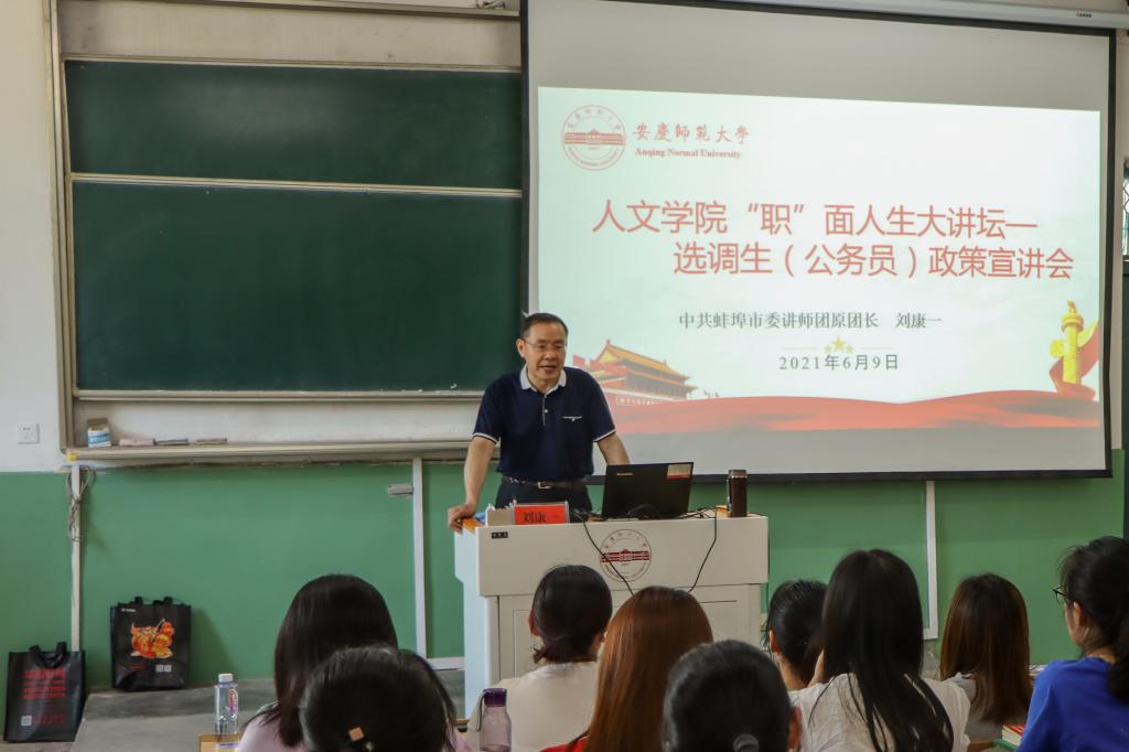 6月9日下午,yl7703永利官网“职”面人生第七期——“选调生(公务员)政策宣讲会”在菱湖校区理二阶教室举办,中共蚌埠市委讲师团原团长,安徽省委下基层宣讲团成员刘康一到校宣讲。学院2018级本科生、研究生党员及入党积极分子100余人次参加宣讲会。