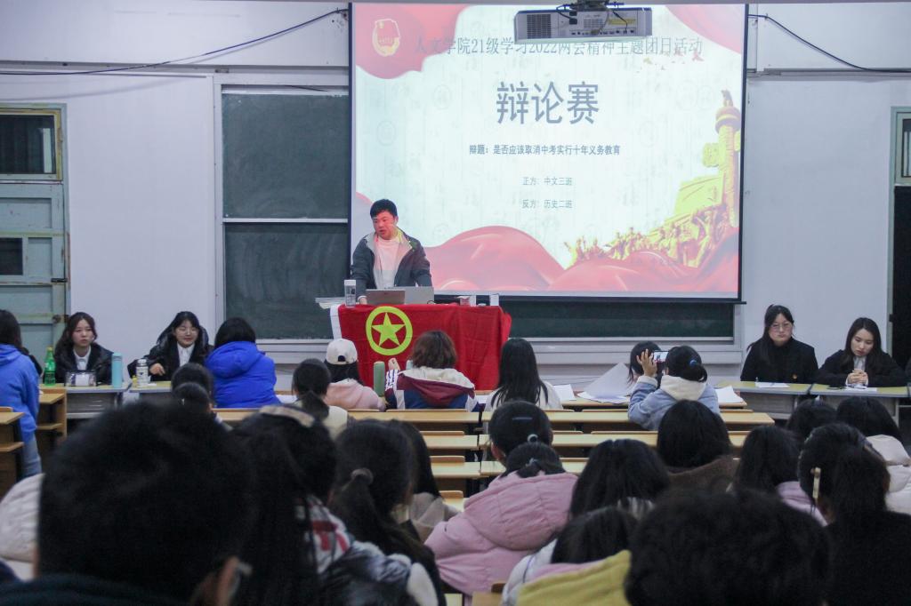 3月25日晚,五场辩论赛同时举行。十支参赛队伍分别围绕“学习英语不如学习音体美”、“是否取消中小学课后服务收费”、“是否取消中考,施行十年义务教育”三个“两会”热点话题展开辩论。经过激烈角逐,中国语言文学类专业2021(1)、(3)、(4)、(6)班、历史学专业2021(3)班获胜。