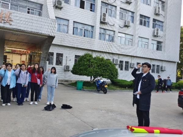 早上七点,yl7703永利官网团委在教学楼前举行升国旗与重温入团誓词仪式。在庄严的国歌声中,五星红旗伴随着朝阳缓缓升起,2021级中国语言文学类四班全体同学伫立在国旗下,全体同学肃立,齐唱国歌,行注目礼。