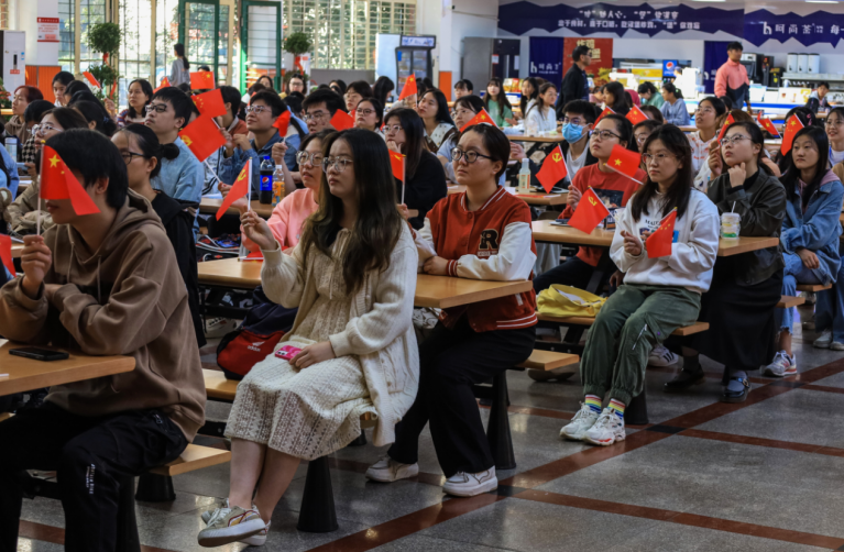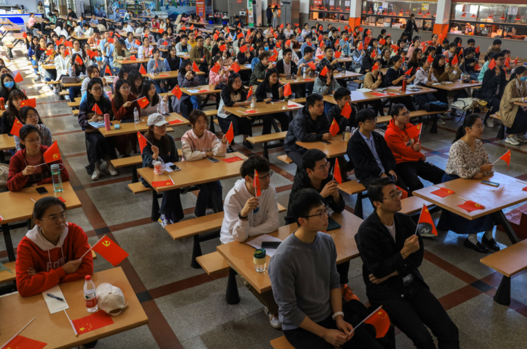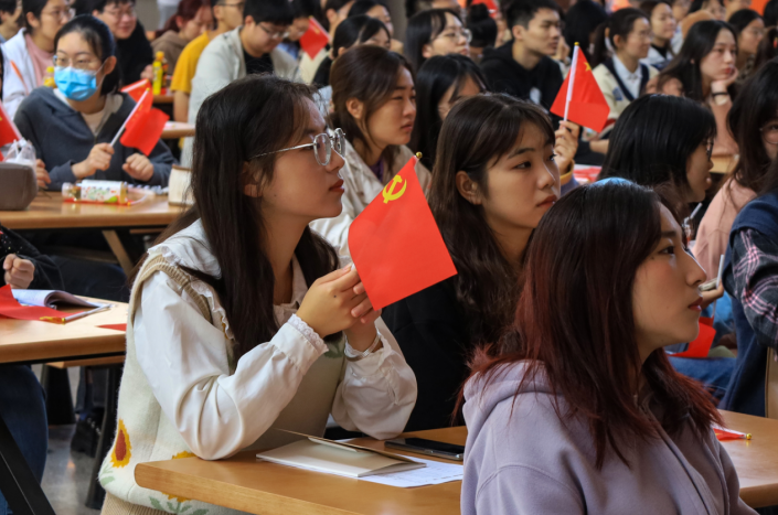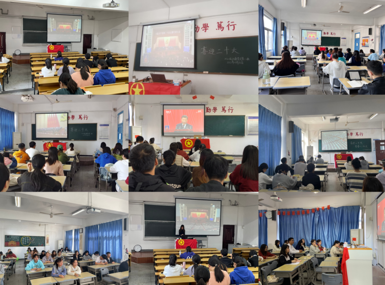 为深入学习贯彻党的二十大精神,yl7703永利官网组织广大团员集中收听收看开幕会直播。上午10时,yl7703永利官网第66期入党积极分子培训班成员、第22期入党发展对象、第2期“青马班”学员近200名学生齐聚敬敷餐厅礼堂。现场气氛庄重热烈,广大青年学生不停地挥舞着党旗和国旗,以最饱满的热情迎接党的二十大胜利召开。