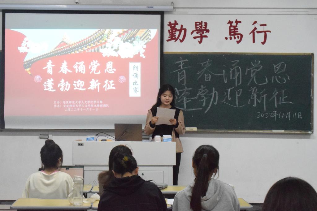 参加此次比赛的选手22级中文四班王颖同学在赛后说:“参加这次朗诵比赛,是因为深切感受到党对我们的关爱与意义重大,也因为朗诵是我的热爱。“青春诵党恩,蓬勃迎新征”朗诵比赛不仅可以培养我们的爱国情怀,还可以提高我们的自信。我们在朗诵的同时,欣赏所朗诵的篇目,也能加深对其的了解与认识,把自己的情感与朗诵篇目原有的情感相融合,更加感念党恩!”