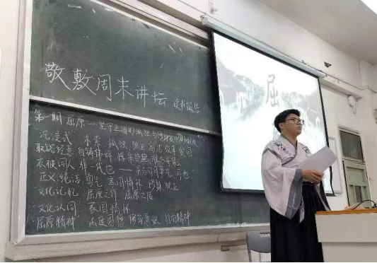 通过敬敷讲坛工作人员的精彩的讲述和认真的演绎,我们走进了这位伟大的爱国诗人——屈原。从自我价值观架构建立到自我价值架构濒临崩溃,怀石投江,屈原的一生是艰辛的却也是“同日月争光”的。然而这份精神力量穿过漫长岁月,依然激然有力地与我们同频共振时,这正是我们追随与古人对话的意义所在,也是这个讲坛的举办意义所在。