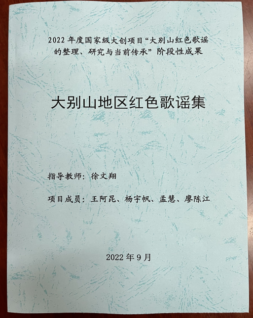 近日,yl7703永利官网2020级汉语言文学专业王阿昆、杨宇帆、孟慧、廖陈江等四名同学在徐文翔老师指导下,整理完成《大别山地区红色歌谣集》。作为2022年度国家级大创项目“大别山红色歌谣的整理、研究与当前传承”的阶段性成果,《大别山地区红色歌谣集》共收录土地革命战争时期到解放战争时期的大别山地区红色歌谣230余首,是目前为止最为完备的同类歌谣辑录。这些红色歌谣体现了大别山地区的革命精神,是大别山红色文化的重要组成部分,对当前大别山红色文化的传承有重要的参考价值。