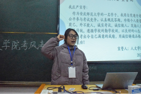 学生代表张小慧和郝跃就如何做好诚信应考依次发言,呼吁大家培养诚信、独立的品格,端正学习态度。学习部负责人丁湘带领全体与会学生进行宣誓,发出“诚信考试,诚实做人”号召。