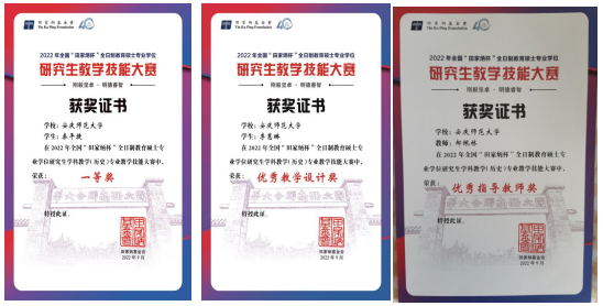 2022年“田家炳杯”全日制教育硕士专业学位研究生教学技能大赛是在全国教育专业学位研究生教育指导委员会指导下,由云南师范大学承办、田家炳教育基金会冠名赞助的系列大赛,是教育硕士专业学位研究生的最高奖项,旨在提升全国教育硕士专业学位研究生的教师专业技能,实现“以赛促学、以赛促训”的活动目标。此次竞赛参赛院校73 所,参赛选手348名。初赛后174名选手进入决赛。本次历史学科的奖项设置极为严苛,一等奖18人,二等奖36人,三等奖52人,优秀教学设计奖 34 人,秦平捷同学所获一等奖的含金量非常高,名列全国前茅。