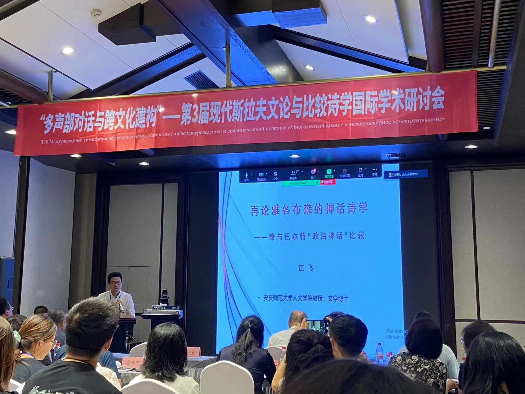 “多声部对话与跨文化建构”——第3届现代斯拉夫文论与比较诗学国际学术研讨会于7月29~30日以线上线下相结合的方式在哈尔滨召开。本次会议由黑龙江大学俄语学院、黑龙江大学俄罗斯语言文学与文化研究中心、中国中外语言文化学会中外文论专业委员会等主办,邀请了来自俄、美、德、英、斯洛伐克、爱沙尼亚、波兰等11个国家的15位外国专家,同时参会的还有北京大学、浙江大学、复旦大学、南京大学、北京师范大学、上海交通大学、中山大学、武汉大学、北京外国语大学、四川外国语大学、上海大学、黑龙江大学和哈尔滨师范大学等兄弟高校80余位专家,以及线上的50余位学者。永利官网江飞教授作为国家社科基金重大项目“现代斯拉夫文论经典名篇汉译与大家名说研究”的课题组成员参加了此次研讨会,并做了题为“再论雅各布森的神话诗学——兼与巴尔特‘政治神话’比较”的大会报告。