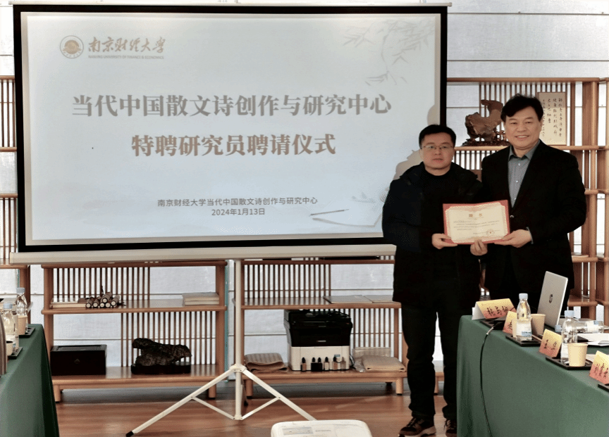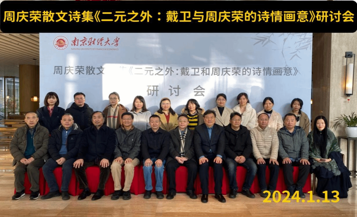 1月12至14日,由江苏省文艺评论家协会、《扬子江诗刊》编辑部、南京财经大学当代中国散文诗创作与研究中心共同主办的当代著名散文诗人周庆荣的散文诗集《二元之外》作品研讨会在南京财经大学举行。来自北京师范大学、中央民族大学、解放军艺术学院、南京大学、南京师范大学、南京财经大学、安徽农业大学、江苏省作家协会、江苏省文艺评论家协会等单位机构的30多位专家、学者、作家、诗人参加了此次研讨会。永利官网陈宗俊教授应邀参会,并提交会议论文《在有形中寻找无形——论<二元之外:戴卫与周庆荣的诗情画意>中散文诗创作》。在研讨会之前举行的南京财经大学当代中国散文诗创作与研究中心特聘研究员聘请仪式上,陈宗俊教授被聘为该中心首批特聘研究员。