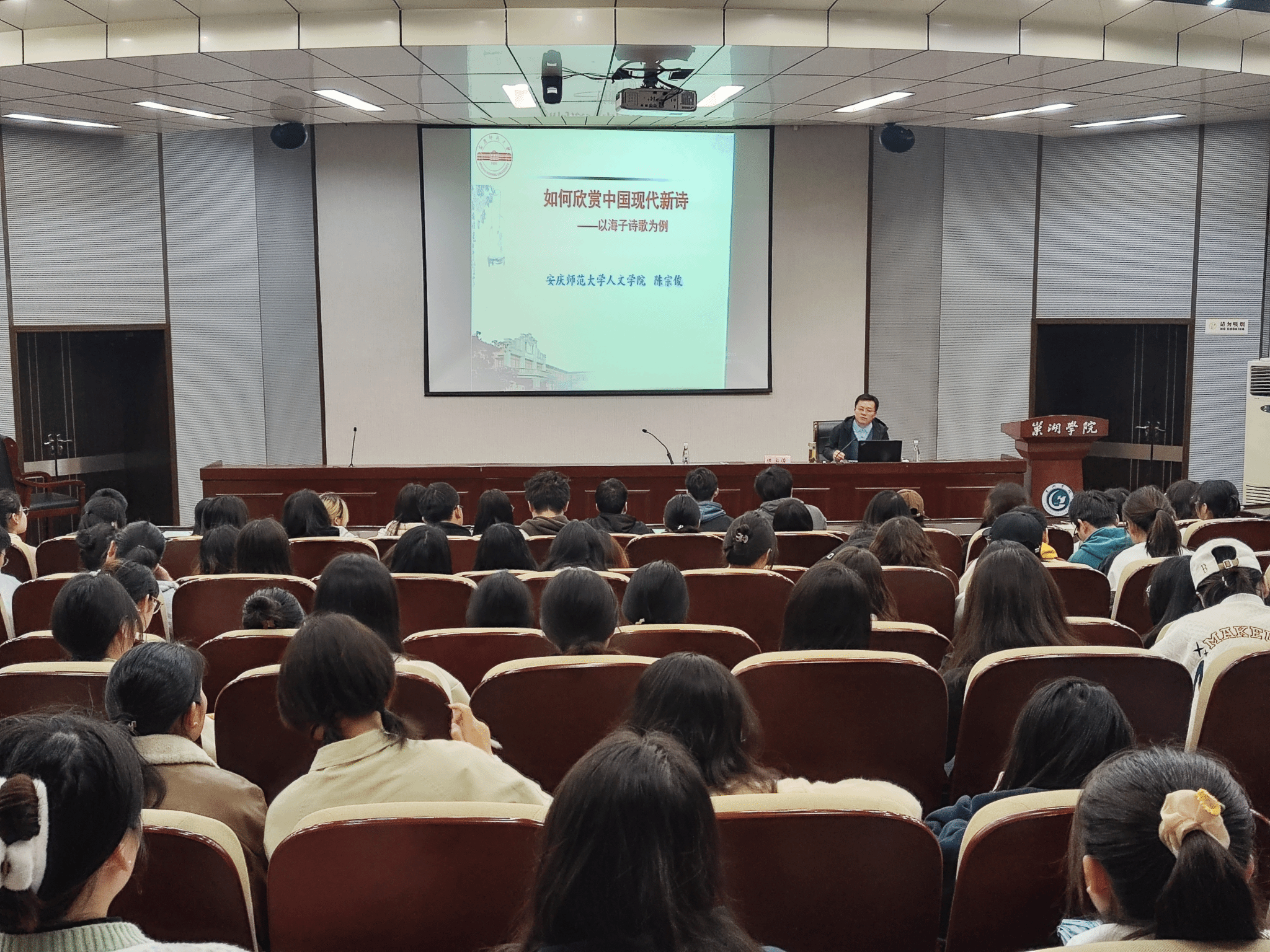 3月23日上午,应巢湖学院文学与传媒学院和科研处的共同邀请,永利官网中国现当代文学专业陈宗俊教授赴该校做了题为“如何欣赏中国现代新诗——以海子诗歌为例”的学术讲座。文学与传媒学院汉语言文学专业的全体学生和部分教师近百人聆听了讲座。讲座由该院中文系主任吴强副教授主持。