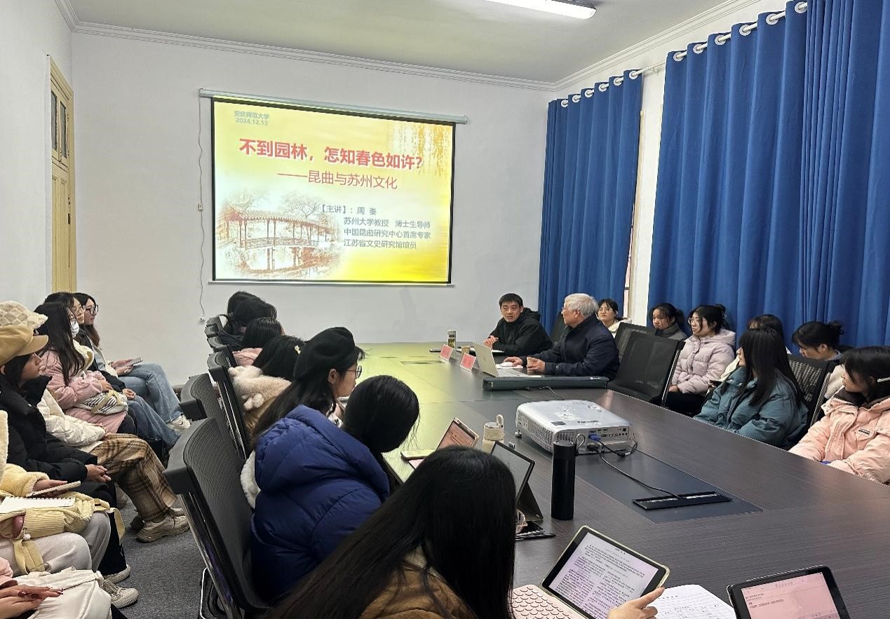 12月13日下午,苏州大学文学院教授、博士生导师、中国昆曲研究中心首席专家、江苏省文史研究馆馆员周秦应邀做客敬敷人文讲坛,主讲题为“不到园林,怎知春色如许?——昆曲与苏州文化”的学术讲座。讲座由yl7703永利官网皖江文化数字化保护与智能处理省级重点实验室执行主任童岳敏教授主持,永利官网本科生及研究生30余人聆听了本次讲座。