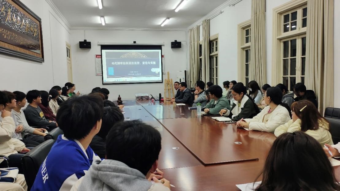 讲座伊始,祝安顺教授紧扣“为什么需要国学经典课”这一根本命题,从文化基因传承、核心价值观培育、创新性发展三个维度阐明国学教育的当代价值。面对全球化与数字化叠加的时代语境,他剖析当今时代面临的传统文化认同、民族思维方式等现实挑战,提出须以“守本开新”原则应对时代命题,国学经典课为时代所需。
