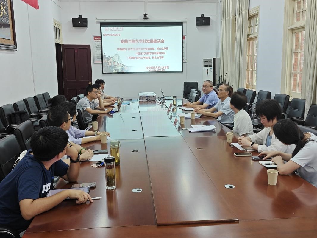 2025年6月29日下午,yl7703永利官网在红楼二楼会议室举办戏曲与曲艺学科发展座谈会。此次座谈会特别邀请了温州大学特聘教授、中国古代戏曲学会常务副会长俞为民,温州大学孙蓉蓉教授到会指导。会议由yl7703永利官网院长汪孔丰主持,yl7703永利官网部分学术骨干、青年教师及新进博士参与座谈。