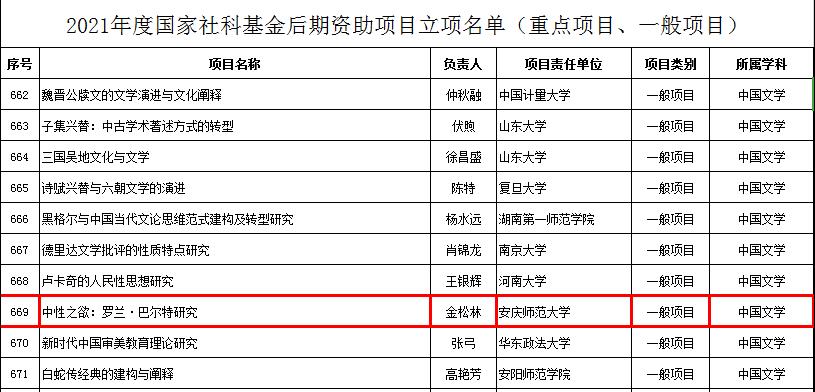 10月8日,全国哲学社会科学工作办公室公示了2021年度国家社科基金后期资助项目立项名单,永利官网金松林教授申报的《中性之欲:罗兰.巴尔特研究》获得立项资助,本次入选是金教授学术研究的又一重大收获,也标志着永利官网的科学研究工作取得重要进展。此前,永利官网金仁义教授、王永兵教授已分别获批国家社科基金项目,这些成就将进一步激发永利官网教师的科研热情,为更多高水平科研成果的产出注入新动能,也为博士点立项建设奠定了坚实基础。