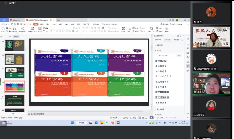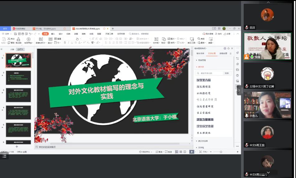 12月1日下午14时,敬敷人文讲坛第二十六讲顺利举行,北京语言大学文学院教授、博士生导师于小植应yl7703永利官网邀请作了题为“文化教材编写的理念与实践”的线上讲座。本次讲座由张瑾博士主持,李金梅副教授与谈,该院部分青年教师、研究生和汉语国际教育专业本科生共50余人参与线上交流学习。