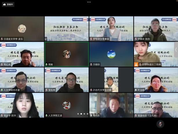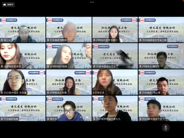 12月11日,“博文通史,探微论闳”yl7703永利官网第二届研究生学术论坛通过线上如期举行。本次论坛得到了校研究生院的大力支持,由开幕式、主题报告、分组讨论和闭幕式等环节组成。学校办公室主任、yl7703永利官网党委书记张红飞,党委研究生工作部部长、研究生院院长华秀梅,yl7703永利官网党政班子成员汪孔丰、王波、沈志富、金松林、周红兵,yl7703永利官网学术委员会主任梅向东,yl7703永利官网教学工作委员会主任、皖江历史文化研究中心主任叶当前,校档案馆(博物馆)馆长金仁义,研究生导师代表、校内外专家、评议老师以及中国语言文学、中国史、学科教学(语文)(历史)等专业的研究生和部分本科生共150余人相聚云端。论坛开幕式由yl7703永利官网副院长沈志富主持。