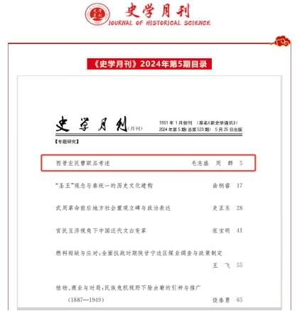 近日,yl7703永利官网2022级中国史专业硕士研究生毛志盛同学以第一作者撰写的学术论文《西晋左民曹职品考述》在历史学类知名CSSCI来源期刊《史学月刊》(2024年第5期)发表。该论文系与导师周群教授合作完成,并得到国家“十四五”规划重大学术文化工程《(新编)中国通史》纂修工程基金项目的支持,是校级科研平台中国中古史研究中心最新学术成果。