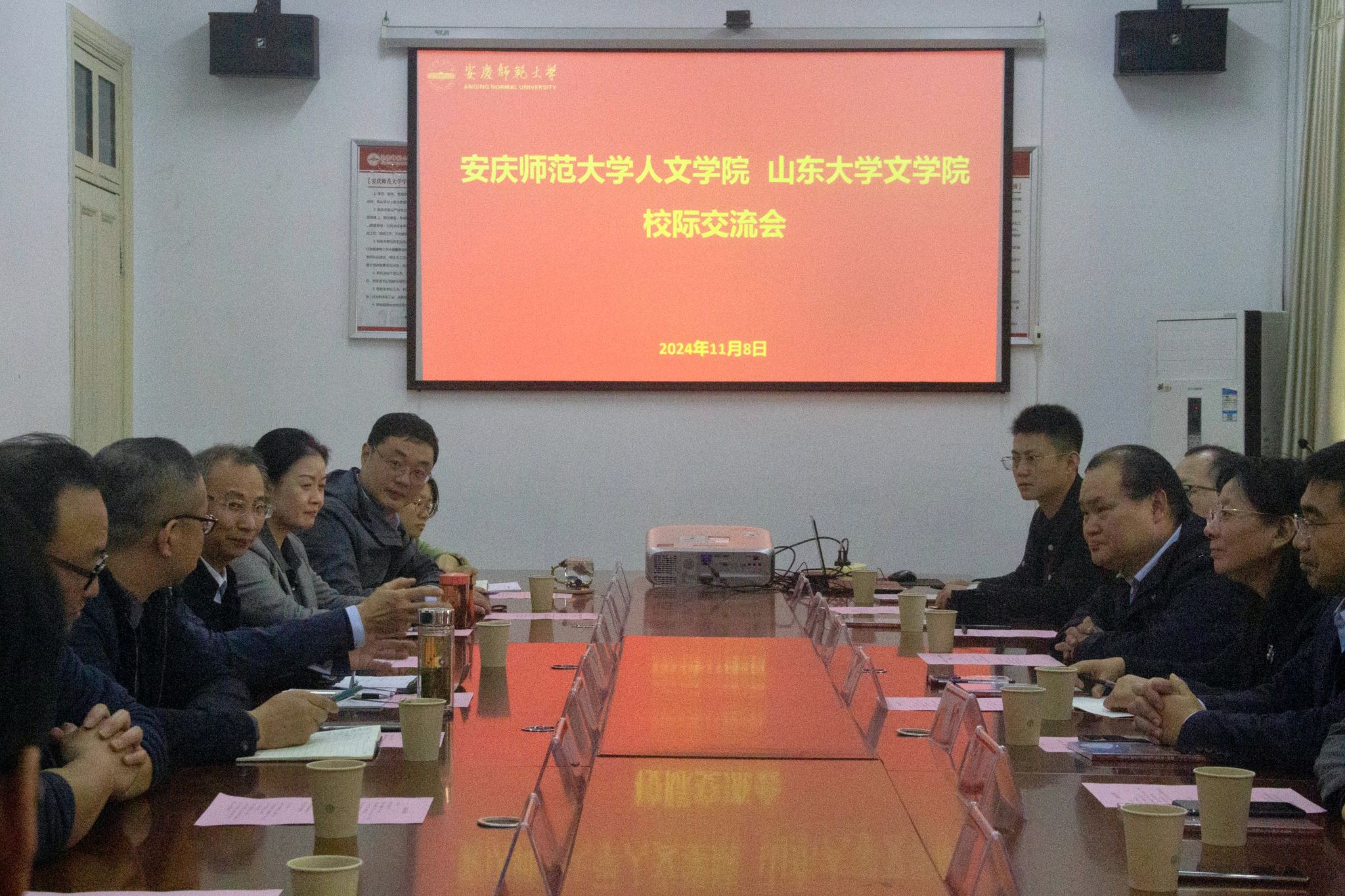 为深化校际间交流,提升合作交流空间,共绘发展蓝图,11月8日,yl7703永利官网与山东大学文学院在菱湖校区开展校际交流与合作。yl7703永利官网党政班子与山东大学文学院党委书记郭春晓、东北亚学院党委书记梁奉军一行共叙情谊、共商合作、共谋发展、共话未来。教授代表、安庆市教体局负责人、山大校友代表等参加会议。会议由学院党委书记王波主持。