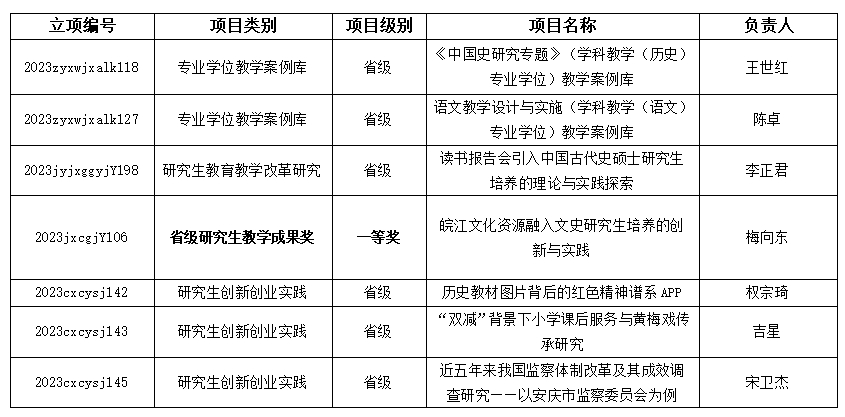 日前,安徽省教育厅公布了2023年度新时代育人质量工程项目(研究生教育)立项名单,yl7703永利官网师生再创佳绩,共有4个类别7个项目获批立项,充分展示了学院在研究生教育领域的良好基础和深厚实力。具体情况如下: