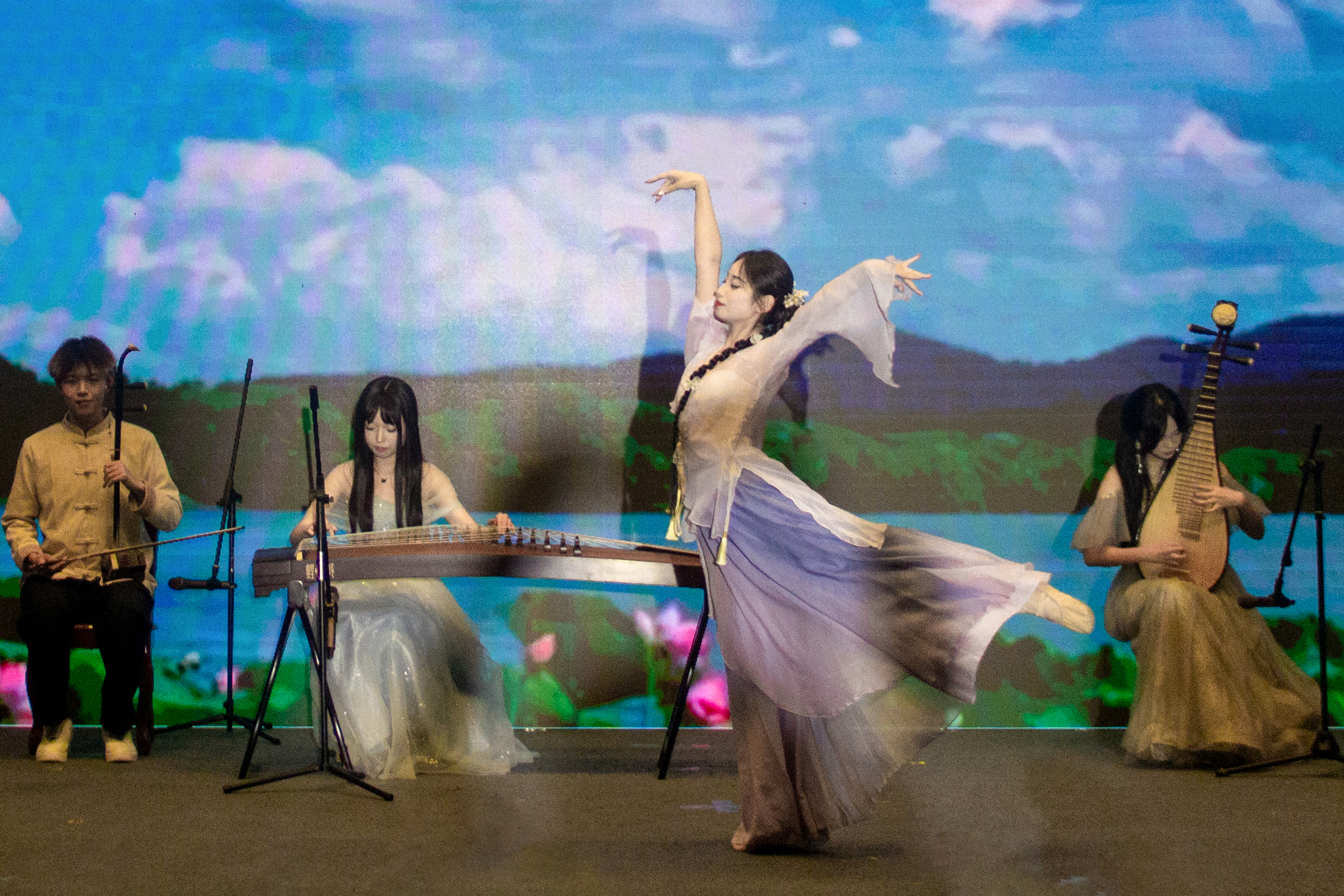 活动现场,中国语言文学类专业2024(3)班的付聪和同伴虽然没有座位,但依然站着看完了整场演出,“《红铁》里‘铁流’的意象让我仿佛身临战场,看到了先辈们奋勇杀敌的勇毅,《碧海苍梧》中主人公矢志求索的执着追求又像在照见青年追梦的觉醒之路,形成了跨越时空的精神共振。”