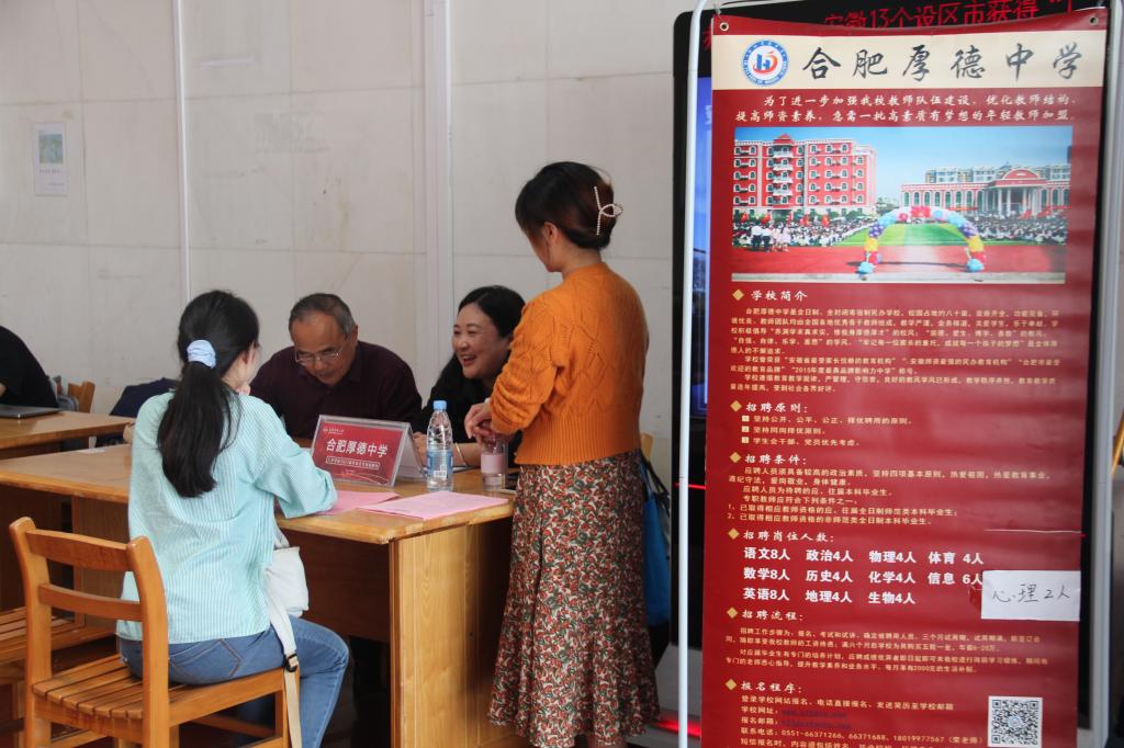 招聘会共有北京师范大学宣城学校、肥东圣泉中学、萧县鹏程中学等19所学校,提供了岗位268个,涵盖了中文、历史等学科,吸引了近七百余名学生参与。
