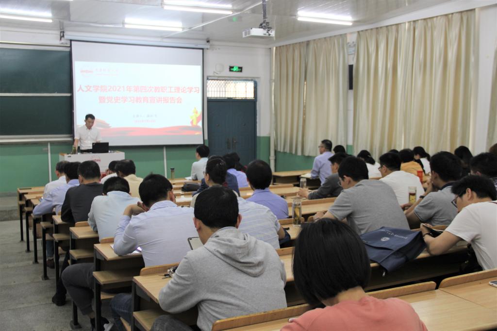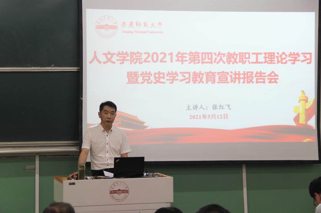 5月12日,yl7703永利官网在菱湖校区化学楼理二阶教室举办2021年第4次教职工政治理论学习暨党史学习教育宣讲报告会。人文学院党委书记、校党史学习教育宣讲团成员张红飞作专题报告,领导班子成员和全体教职工参加会议。