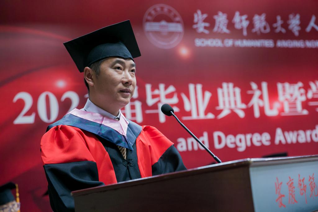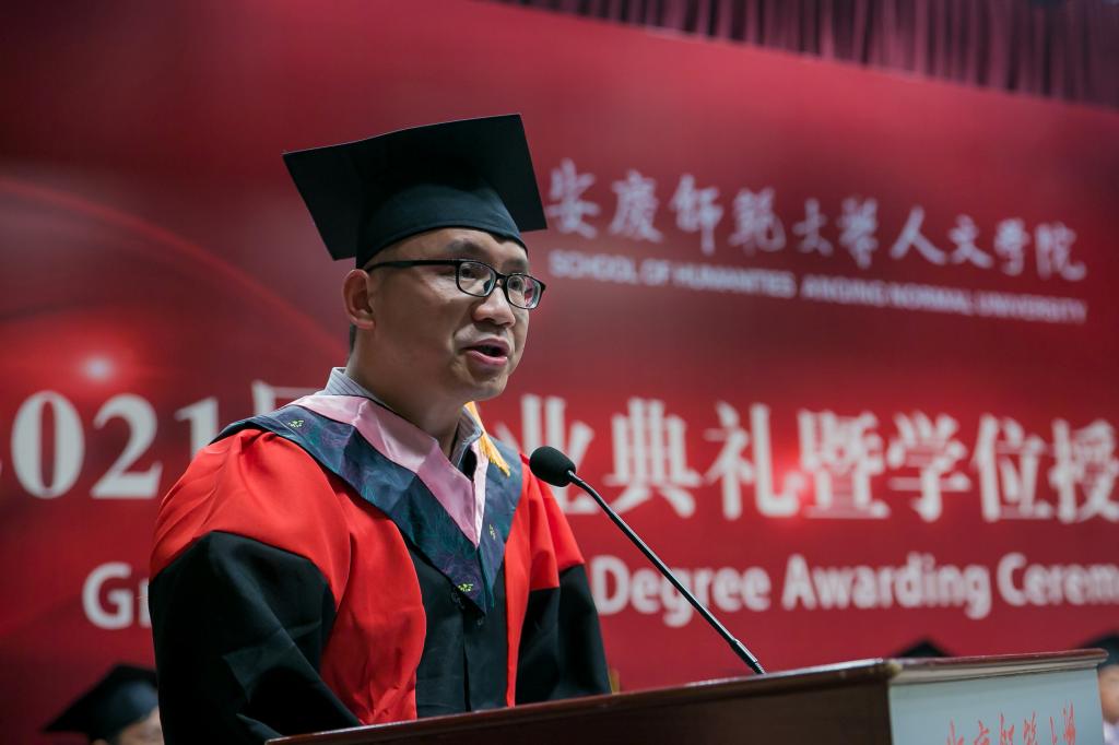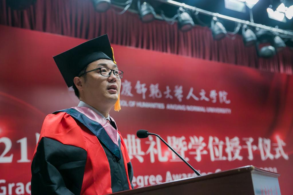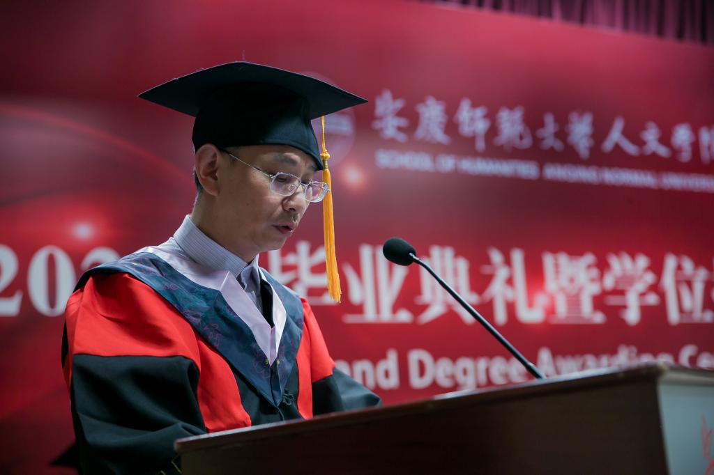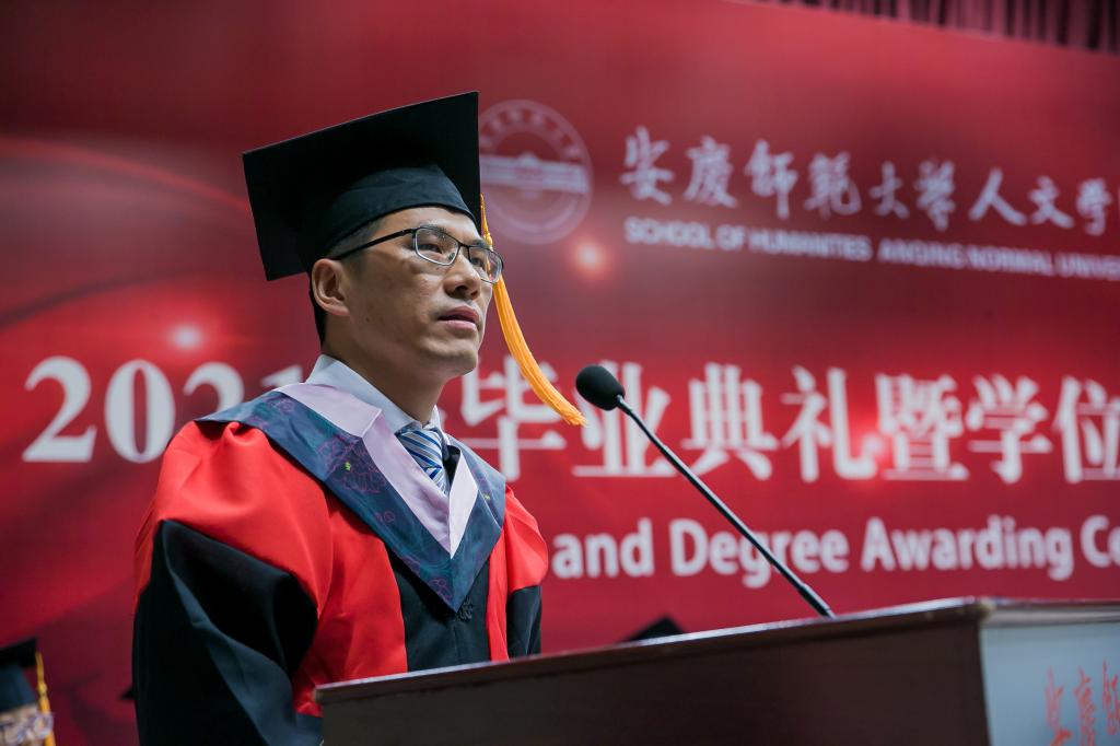 校“三全育人”最美教师、yl7703永利官网教授、硕士生导师江飞作为教师代表为毕业生送上祝贺与期待。他勉励毕业生永远不要忘记自己作为人文知识分子身份和责任,成为一个脚下有根心中有光的人。
