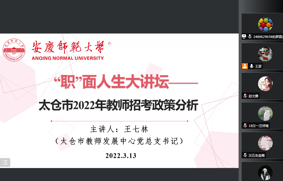 为帮助毕业生科学研判就业形势,树立正确求职理念,3月13日晚,yl7703永利官网线上举办了2022年江苏省太仓市教师招考考情分析暨教师专业发展经验分享会。太仓市教师发展中心党总支书记王七林,太仓市沙溪镇三小教师、2020届汉语言文学毕业生赵文雅,太仓市双凤中学教师、2021届汉语言文学毕业生郑博文应邀参加。会议由yl7703永利官网党委副书记王波主持,2018级、2019级部分学生近两百人线上聆听学习。