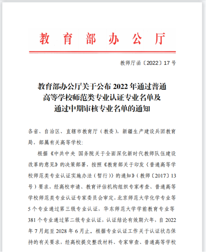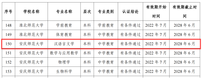 近日,教育部办公厅公布了2022年通过普通高等学校师范类专业认证专业名单,yl7703永利官网汉语言文学专业顺利通过师范类专业中学教育第二级认证。yl7703永利官网汉语言文学专业最早可追溯至20世纪20年代至30年代省立安徽大学时期,建国后于1977年开始本科招生,经过四十余年的持续建设,汉语言文学专业先后获批国家级一流本科专业建设、省级综合改革试点专业、省级特色专业、省级一流人才示范引领基地、省级“六卓越、一拔尖”卓越人才培养创新项目建设点,并于2019年获批为安徽省博士学位授权立项建设学科、安徽省高峰培育学科。
