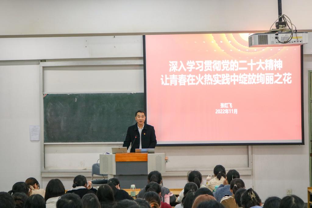 11月23日,yl7703永利官网举行党的二十大精神宣讲报告会,学院党委书记张红飞在教学楼414教室作“深入学习贯彻党的二十大精神 让青春在火热实践中绽放绚丽之花”主题宣讲。学院第66期入党积极分子培训班和第23期发展对象培训班120余名学员聆听宣讲报告。