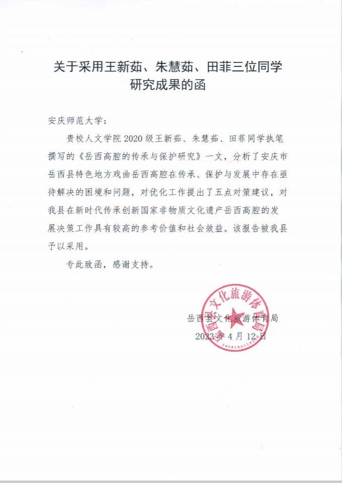 近日,我校收到岳西县文化旅游体育局公函,由人文学院2020级王新茹、朱慧茹、田菲同学执笔撰写的《岳西高腔的传承与保护研究》一文得到了岳西县政府部门采用。