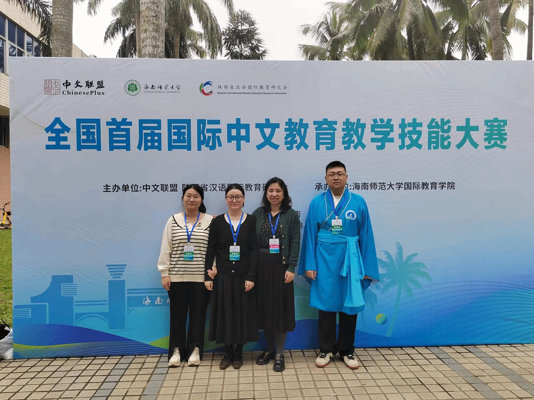 由汉语国际教育研究会与中文联盟、海南师范大学共同主办“全国首届国际中文教育教学技能大赛”于2023年12月2日至3日在海南师范大学龙昆南校区成功举办。yl7703永利官网张瑾老师带队,2022级汉语国际教育专业张佳怡、胡晓凤、2023级国际中文教育硕士生罗浩诚三名选手赴海口参赛。
