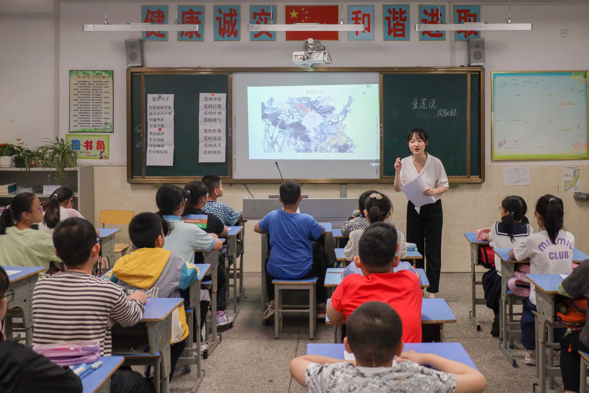 上课铃声响起,2022级学科教学(语文)方向研究生丁雨琛以《爱莲说》开启了本学期的第一次授课。丁雨琛用生活实际作为课堂引入,以重点字词、重点句为抓手,带领孩子们在音乐的浸润下品读莲花坚贞的品格,感受周敦颐洁身自爱的高洁人格和洒落的胸襟。教学路径清晰,课堂氛围活跃。