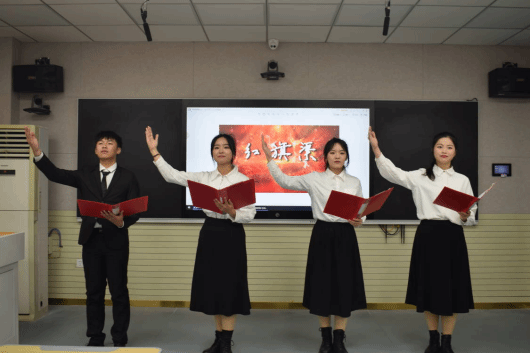“中国,我要为你写一首诗,用太阳金色的语言,用心海浩瀚的蔚蓝!”在高昂热烈的伴奏中,来自yl7703永利官网中国语言文学类的宣子宜、刘晴雨和田鑫合诵一首《“青春”之跨越百年的对话》,激昂的嗓音中,她们与百年前在中国危亡之际抛头颅、洒热血的青年对话,展今日中国之雄伟,彰今日青年之奋发,立下青春的铮铮誓言。