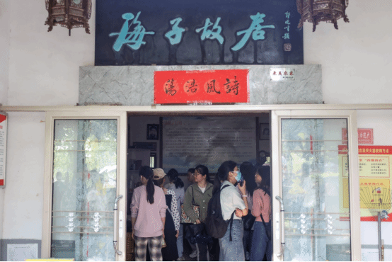 “五岁的黎明,五岁的马,你面朝江水,坐下……可能是姻缘,也可能是友情。”在本次实践教学的第一站——海子故居及其纪念馆,yl7703永利官网学子在海子故居门前的广场上,齐声朗诵了海子的诗歌《给安庆》。海子原名查海生,是当代著名诗人,在他短暂的一生中,共创作了近200万字的作品。海子的故居是一座简朴的小瓦房,屋内悬挂有海子的照片,并保留着海子书房。其中一本记录来访者留言的笔记本上,记录了许多当代诗人对海子的赞美和怀念。在故居旁的海子纪念馆中,陈列有海子的生前遗物,完整呈现了海子一生的经历,展示了他各个时期所创作的诗歌作品。师生们低吟着海子的诗句,回顾了他短暂而又灿烂的一生。对海子故居的调研之行实现了让书中人物“活过来”,有利于增强人文学子对所学专业的感性认识,提升专业认知水平。